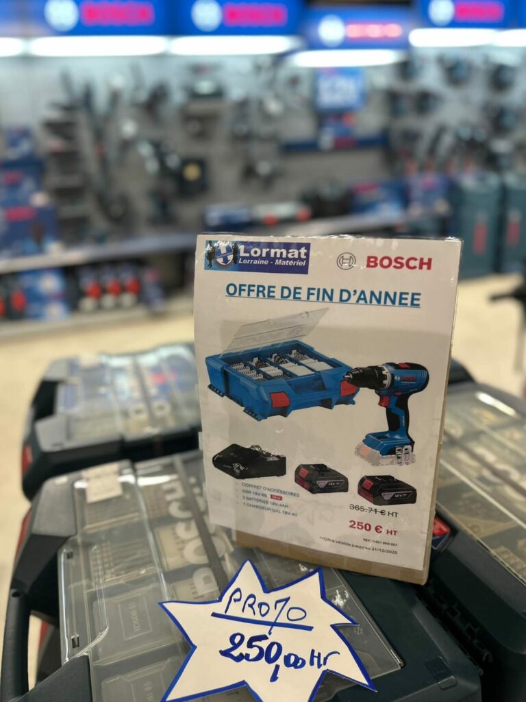 Perceuse-visseuse Bosch pack en promotion à 250€ HT à Nancy Offre de fin d’année immanquable chez LORMAT Nancy : perceuse-visseuse Bosch Professional avec batterie et chargeur
